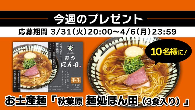 【X懸賞】「秋葉原 麺処ほん田」のお土産麺を10名様にプレゼント 2026.04.05ラーメンWalker‐プレゼントキャンペーン 賞品:「秋葉原 麺処ほん田」のお土産麺(10名様) 締切:2026年4月6日(月)①今週公開の生放送で発表のキーワードと一緒にポストを引用RP ②本アカウントもフォロー※詳細はキャンペーンページにてご確認ください。応募はこちらから