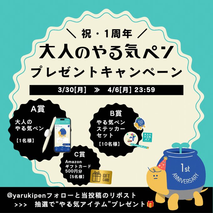 賞品:大人のやる気ペン、やる気ペンステッカーセット、Amazonギフトカード500円分(合計16名様)