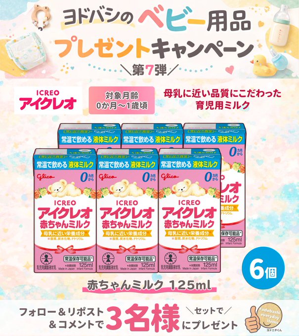 【X懸賞】アイクレオ「赤ちゃんミルク 125mL」6個セットを3名様にプレゼント 2026.04.05ヨドバシ@日用品専門‐プレゼントキャンペーン 賞品:アイクレオ「赤ちゃんミルク 125mL」6個セット(3名様) 締切:2026年4月7日(火)👉フォロー&リポスト👉どんな時に飲んでもらいたいですか?✍️※詳細はキャンペーンページにてご確認ください。応募はこちらから