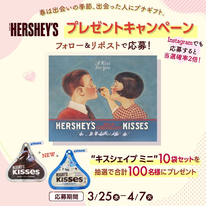 【X・Instagram懸賞】ハーシー キスシェイプ ミニ 10袋を100名様にプレゼント 2026.04.05HERSHEY’S プレゼントキャンペーン 賞品:ハーシー キスシェイプ ミニ 10袋(100名様) 締切:2026年4月7日(火)公式Xアカウントをフォロー&キャンペーン対象ポストをリポストしてご応募ください。Instagramからも応募できます。※詳細はキャンペーンページにてご確認ください。応募はこちらから