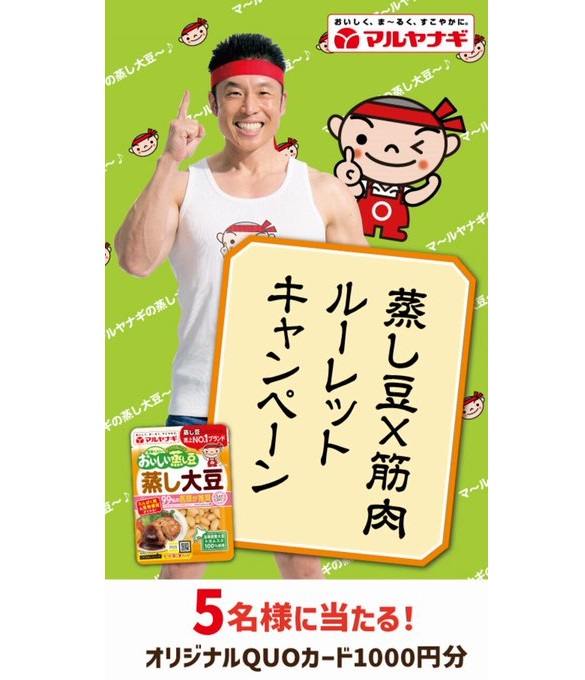 【X・Instagram懸賞】なかやまきんに君オリジナルQUOカード1,000円分を10名様にプレゼント 2026.04.05蒸し大豆のマルヤナギ‐「おいしい蒸し豆」シリーズ3億食突破記念 蒸し豆×筋肉ルーレット SNSキャンペーン 賞品:なかやまきんに君オリジナルQUOカード1,000円分(10名様) 締切:2026年4月7日(火)抽選で、ここでしか手に入らない 「なかやまきんに君オリジナルQUOカード」をプレゼント🎁Instagramからも応募できます。※詳細はキャンペーンページにてご確認ください。応募はこちらから
