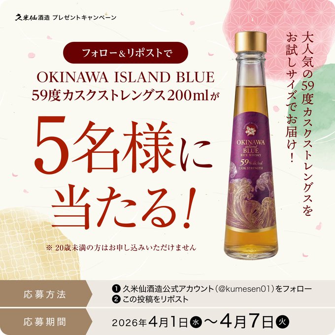 賞品:沖縄 ISLAND BLUE 59度 カスクストレングス 200ml(5名様)