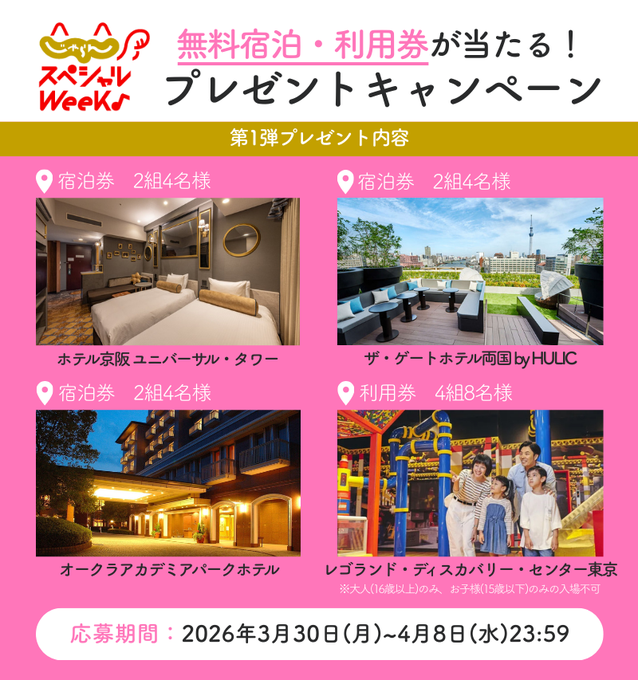 【X懸賞】無料宿泊券・利用券を合計10名様にプレゼント 2026.04.07#じゃらんスペシャルウィーク 開催記念 賞品:無料宿泊券・利用券(合計10名様) 締切:2026年4月8日(水)公式X(Twitter)アカウントをフォロー&キャンペーン対象ポストをリポストしてご応募ください。※詳細はキャンペーンページにてご確認ください。応募はこちらから