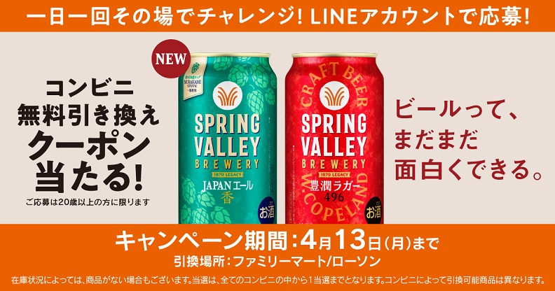 賞品:SPRING VALLEY BREWERY 豊潤ラガー 496 350ml缶、SPRING VALLEY BREWERY JAPANエール 香 350ml缶 コンビニ無料クーポン(計13万名様)