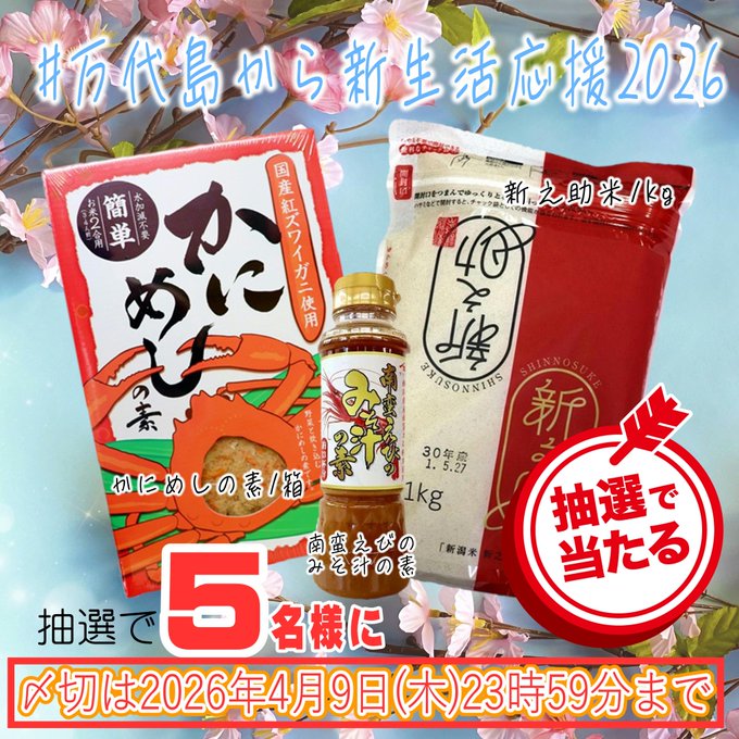 【X懸賞】かにめしの素など3つセットを5名様にプレゼント 2026.04.08万代島鮮魚センター‐新生活応援キャンペーン 賞品:かにめしの素など3つセット(5名様) 締切:2026年4月9日(木)公式X(Twitter)アカウントをフォロー&キャンペーン対象ポストをリポストしてご応募ください。※詳細はキャンペーンページにてご確認ください。応募はこちらから