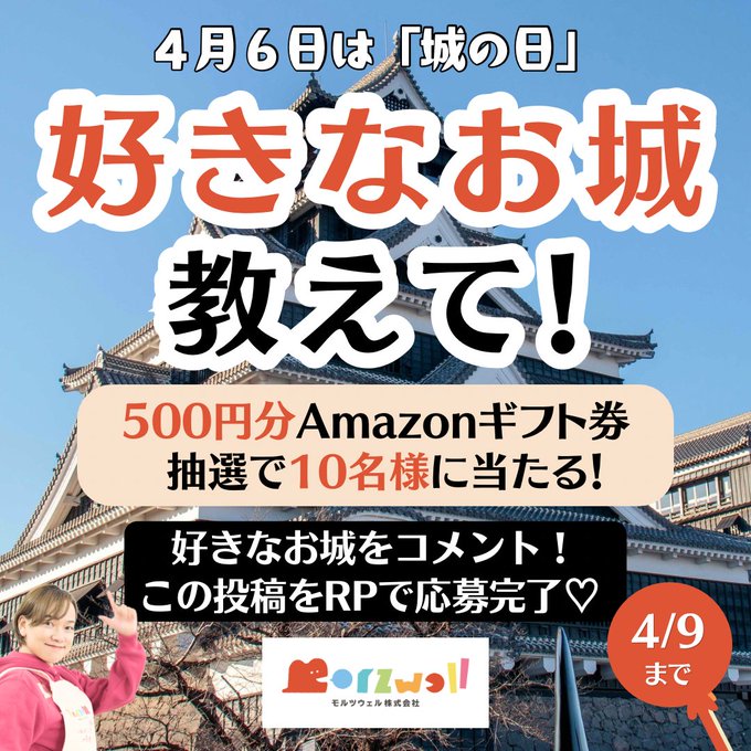 【X懸賞】Amazonギフト券500円分を10名様にプレゼント 2026.04.08モルツウェル‐好きなお城 コメントで教えて 賞品:Amazonギフト券500円分(10名様) 締切:2026年4月9日(木)23:00応募方法 1️⃣投稿に「好きなお城」をコメント 2️⃣投稿をRP(リポスト)※詳細はキャンペーンページにてご確認ください。応募はこちらから