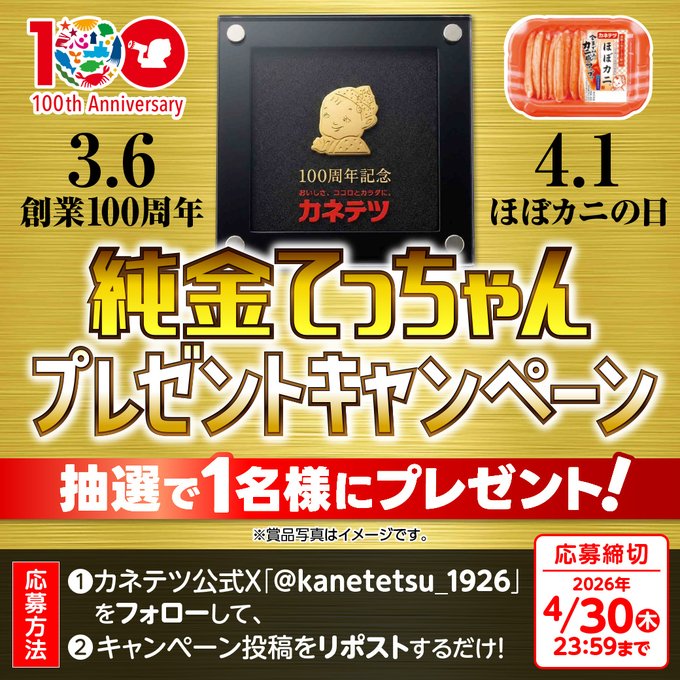 カネテツ創業100周年×ほぼカニの日記念 純金てっちゃんプレゼントキャンペーン