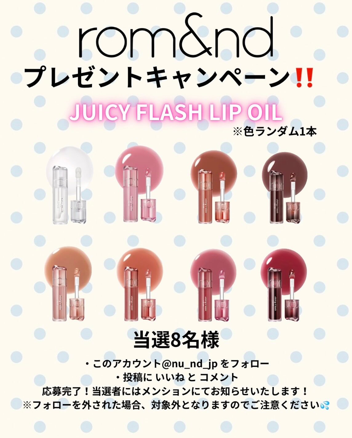 【Instagram懸賞】ロムアンド新作リップオイルを8名様にプレゼント 2026.04.08rom&nd‐発売記念キャンペーン 賞品:ロムアンド新作リップオイル(8名様) 締切:2026年4月10日(金)応募方法 →いいね・コメントにて完了 (好きな色を教えてね)※詳細はキャンペーンページにてご確認ください。応募はこちらから