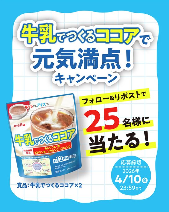 賞品:meito牛乳でつくるココア(25名様)