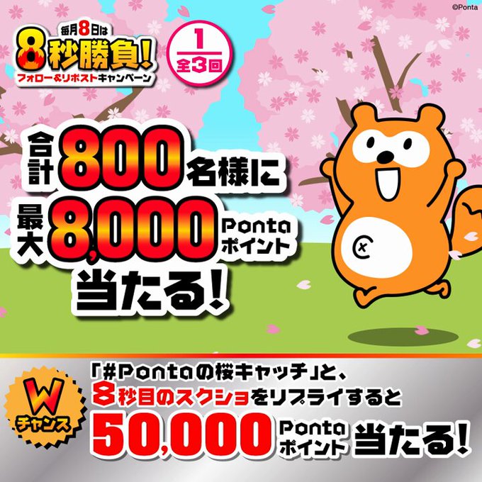 【毎日・X懸賞】最大8,000Pontaポイントを800名様にプレゼント 2026.04.09Pontaの桜キャッチ 賞品:最大8,000Pontaポイント(800名様) 締切:2026年4月10日(金)Ponta公式Xアカウントをフォロー&キャンペーン対象ポストをリポストしてご応募ください。※詳細はキャンペーンページにてご確認ください。応募はこちらから