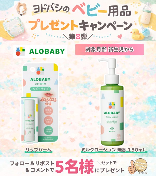 【X懸賞】アロベビー ミルクローション 無香 150ml&リップバームを5名様にプレゼント 2026.04.09ヨドバシ@日用品専門‐プレゼントキャンペーン 賞品:アロベビー ミルクローション 無香 150ml&リップバーム(5名様) 締切:2026年4月10日(金)👉フォロー&リポスト👉「アロベビー」の印象を✍️※詳細はキャンペーンページにてご確認ください。応募はこちらから