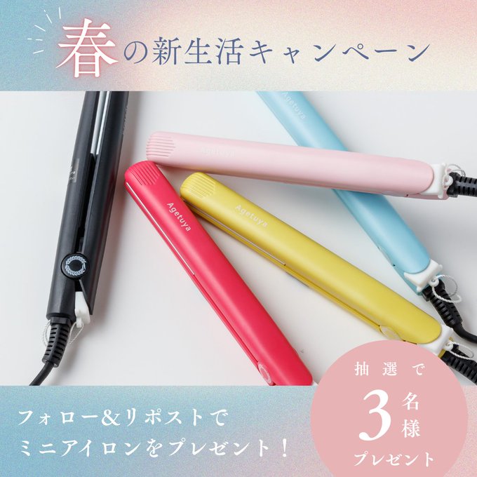 【X懸賞】Agetuya ミニアイロンを3名様にプレゼント 2026.04.09Agetuya新生活応援 賞品:ミニアイロン(3名様) 締切:2026年4月10日(金)公式X(Twitter)アカウントをフォロー&キャンペーン対象ポストをリポストしてご応募ください。※詳細はキャンペーンページにてご確認ください。応募はこちらから