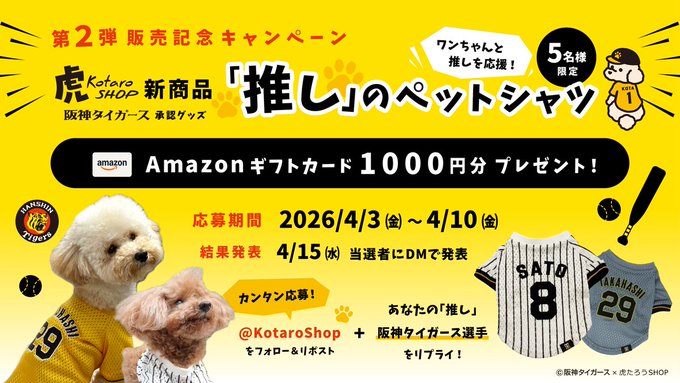【X懸賞】Amazonギフト券1,000円分を5名様にプレゼント 2026.04.09虎たろうSHOP‐プレゼントキャンペーン 賞品:Amazonギフト券1,000円分(5名様) 締切:2026年4月10日(金)①@Kotaroshopをフォロー ②投稿をリポスト ③「推し」阪神選手をリプライ※詳細はキャンペーンページにてご確認ください。応募はこちらから