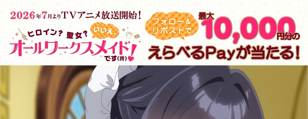 TVアニメ『ヒロイン?聖女?いいえ、オールワークスメイドです(誇)!』公式Xアカウントをフォロー&キャンペーン対象ポストをリポストして、記載されているURLからご応募ください。