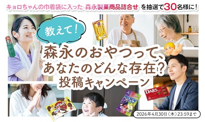 キョロちゃんの巾着袋に入った 森永製菓商品詰め合わせを30名様にプレゼント 2026.04.09エンゼルPLUS‐“教えて!森永のおやつって、あなたのどんな存在?”投稿キャンペーン 賞品:キョロちゃんの巾着袋に入った 森永製菓商品詰合せ(30名様) 締切:2026年4月30日(木)ご応募には会員登録/ログインが必要です。※詳細はキャンペーンページにてご確認ください。応募はこちらから
