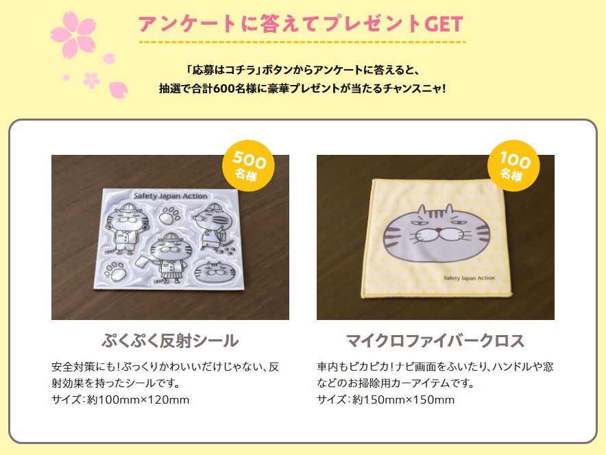 できるニャン マイクロファイバークロス、ぷくぷく反射シールを合計600名様にプレゼント 2026.04.09Honda‐Safety Japan Actionキャンペーン 賞品: ・マイクロファイバークロス(100名様) ・ぷくぷく反射シール(500名様) 締切:2026年4月20日(月)アンケートに答えてご応募ください。※詳細はキャンペーンページにてご確認ください。応募はこちらから