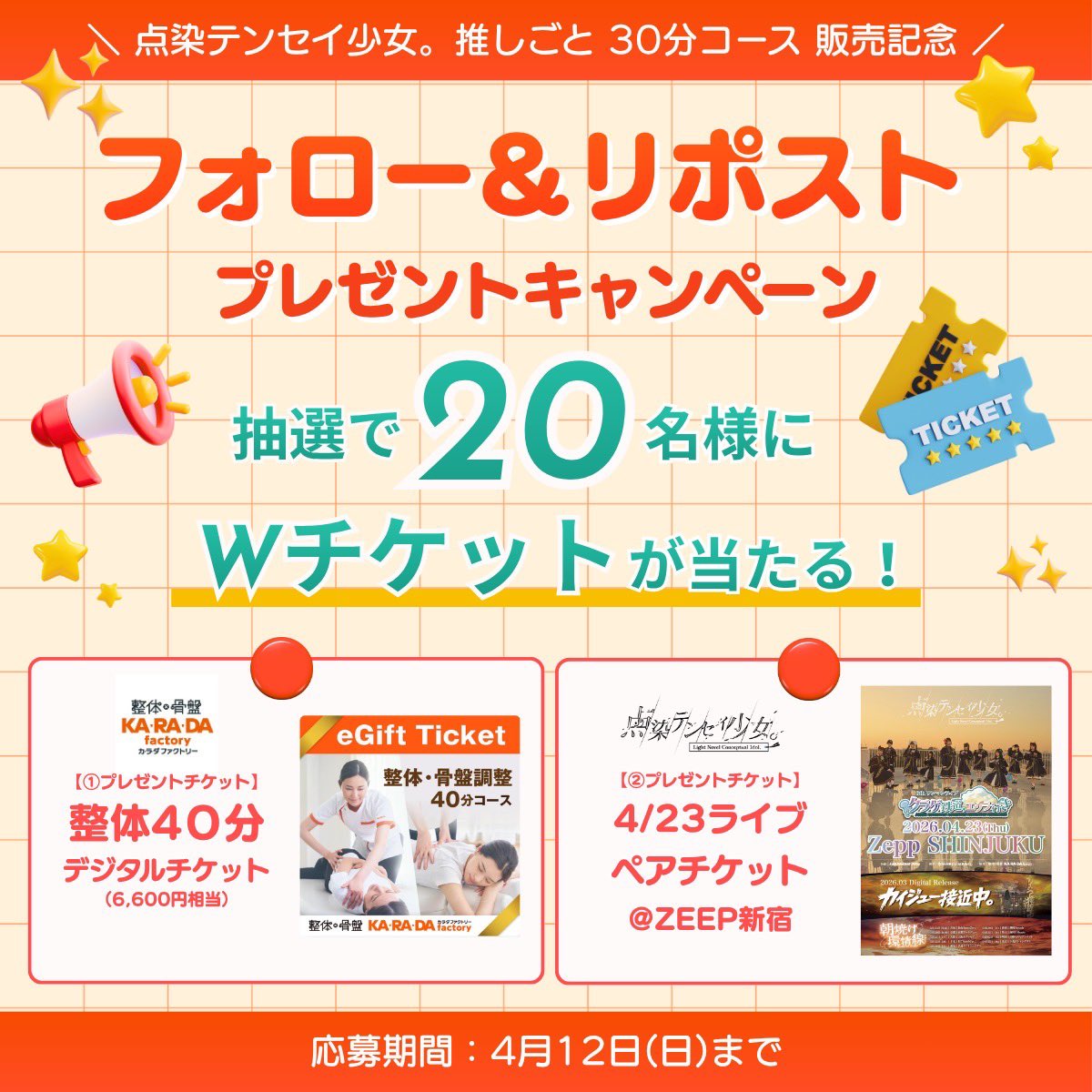 賞品:整体40分デジタルチケット&点染テンセイ少女。ライブペアチケット(20名様)