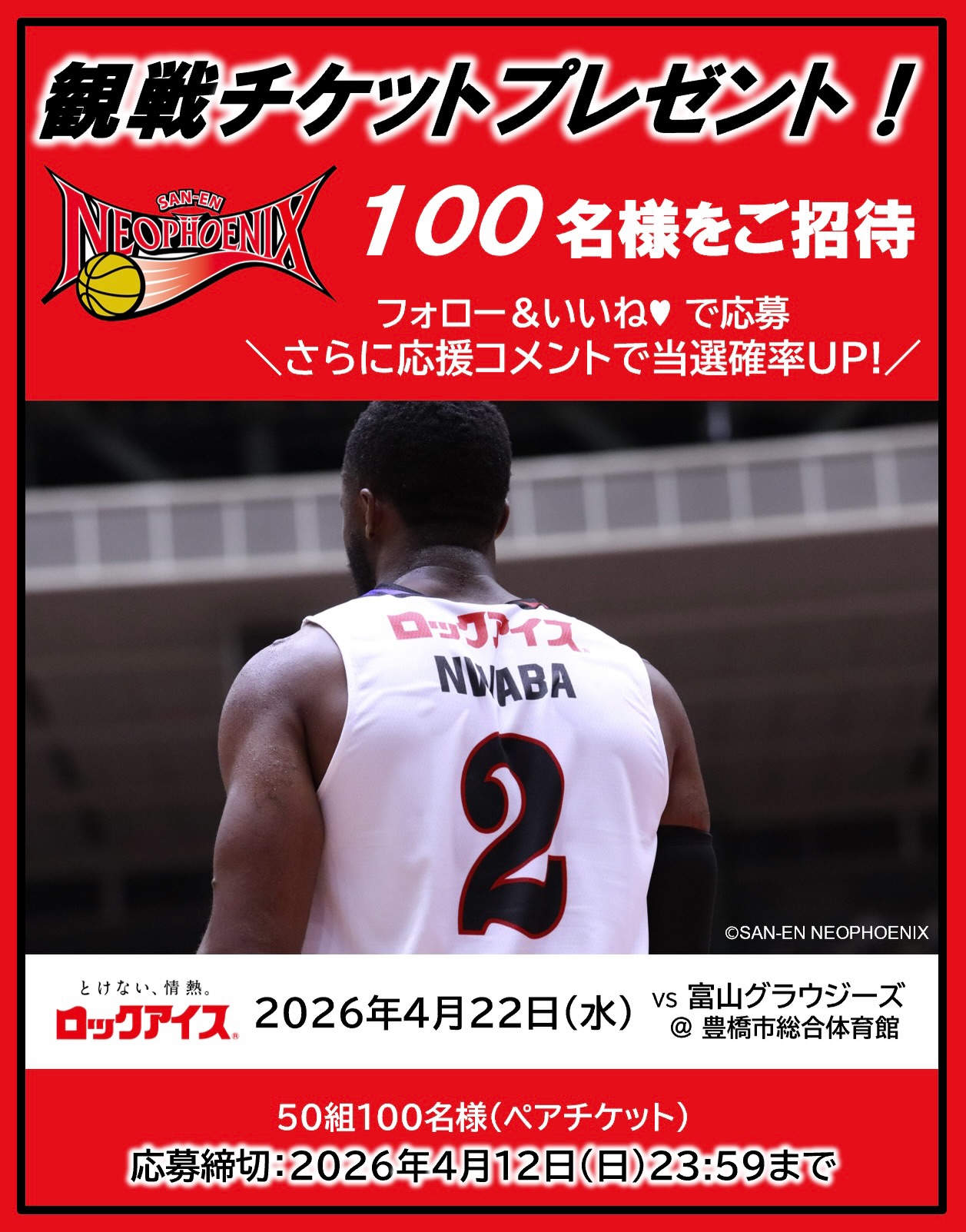 賞品:三遠ネオフェニックス 観戦チケット(50組100名様)