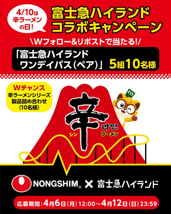 【X・Instagram懸賞】富士急ハイランドワンデイパス(ペア)、辛ラーメンシリーズ製品詰め合わせを合計15名様にプレゼント 2026.04.10農心ジャパン‐プレゼントキャンペーン 賞品: 富士急ハイランドワンデイパス(5組10名様) 辛ラーメンシリーズ製品詰め合わせ(10名様) 締切:2026年4月12日(日)@nongshimjapan @fujikyunow をフォロー&キャンペーン対象ポストをリポストしてご応募ください。Instagramからも応募できます。※詳細はキャンペーンページにてご確認ください。応募はこちらから