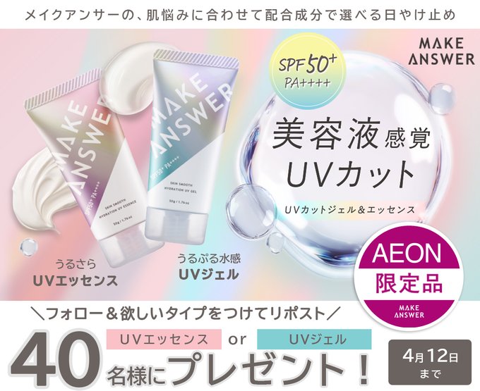 賞品:メイクアンサー スキンスムース ハイドレーション UVジェル&スキンスムース ハイドレーション UVエッセンス(40名様)