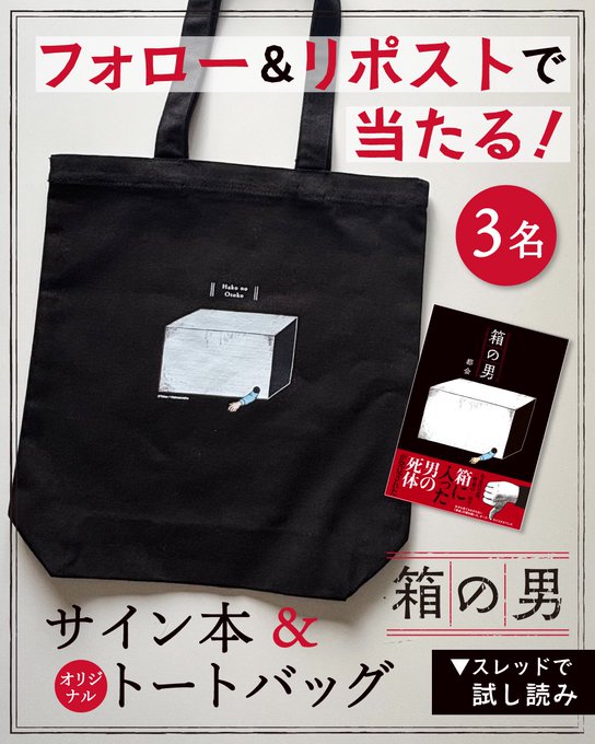 【X懸賞】都会さんサイン本&オリジナルトートバッグを3名様にプレゼント 2026.04.10箱の男‐プレゼントキャンペーン 賞品:都会さんサイン本&オリジナルトートバッグ(3名様) 締切:2026年4月12日(日)①@hako_no_otoko をフォロー ②投稿をリポストor引用リポスト※詳細はキャンペーンページにてご確認ください。応募はこちらから