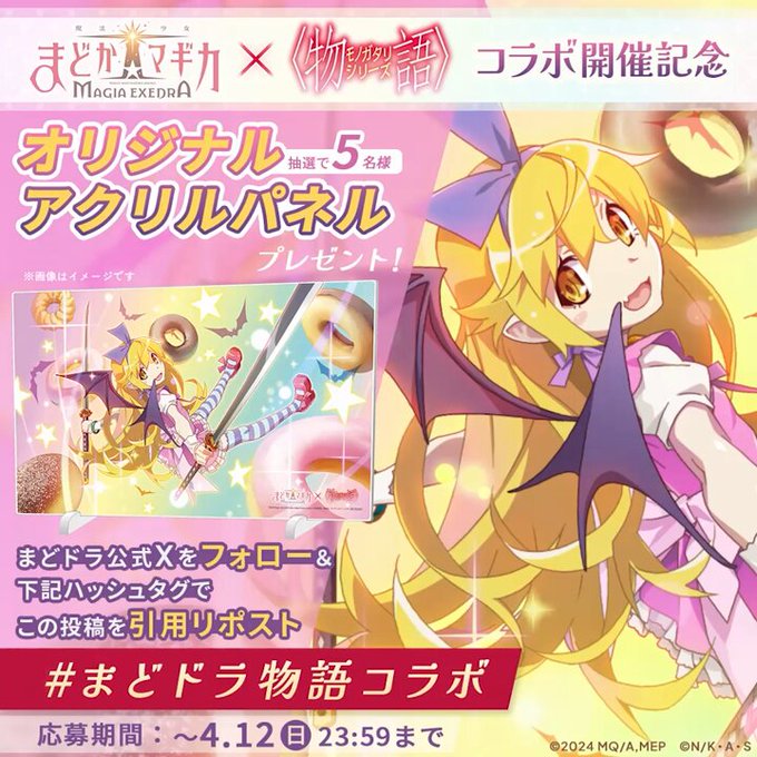 【X懸賞】忍野忍 オリジナルアクリルパネルを5名様にプレゼント 2026.04.11 2026.04.10まどドラ 忍野忍 実装記念 オリジナルアクリルパネルプレゼントキャンペーン 賞品:忍野忍 オリジナルアクリルパネル(5名様) 締切:2026年4月12日(日)フォロー&投稿を【#まどドラ物語コラボ】で引用リポスト※詳細はキャンペーンページにてご確認ください。応募はこちらから