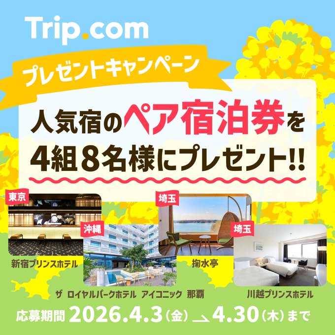 【X・Instagram懸賞】東京、埼玉、沖縄の人気ホテルのペア宿泊券を4組8名様にプレゼント 2026.04.11Trip.com‐プレゼントキャンペーン 賞品:東京、埼玉、沖縄の人気ホテルのペア宿泊券(4組8名様) 締切:2026年4月30日(木)18:00応募方法 ①@TripcomJPをフォロー ②投稿をリポスト ③宿泊したい施設名をコメントInstagramからも応募できます。※詳細はキャンペーンページにてご確認ください。応募はこちらから