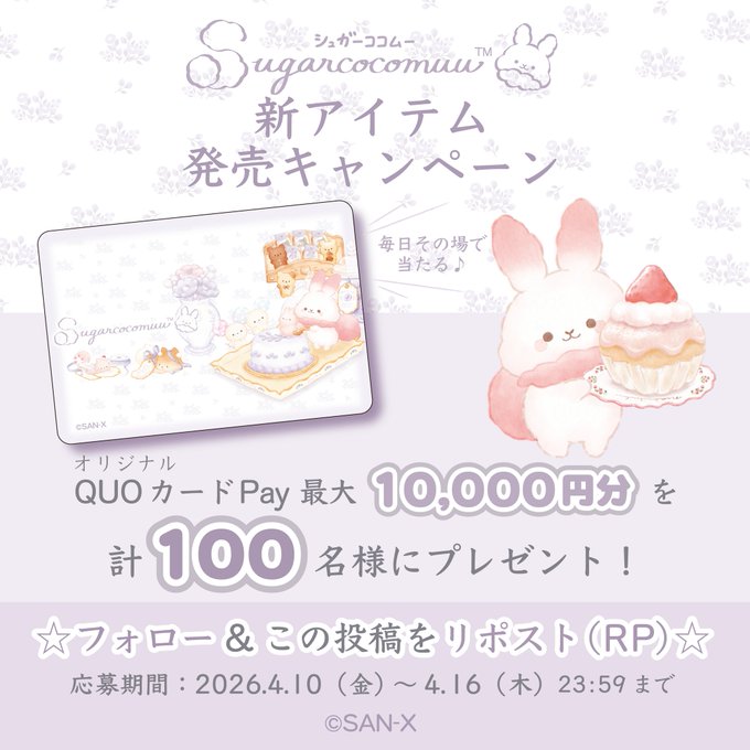 賞品:シュガーココムーのオリジナルQUOカードPay最大10000円分(100名様)