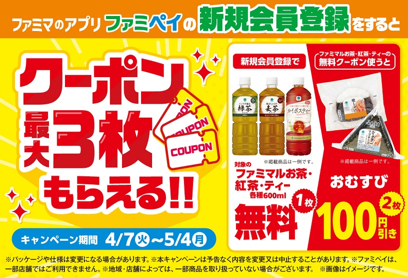 期間中に、新規会員登録特典の「ファミマルお茶600ml各種無料クーポン」を獲得し、利用すると、「おむすび各種100円引きクーポン」が2枚進呈されます。