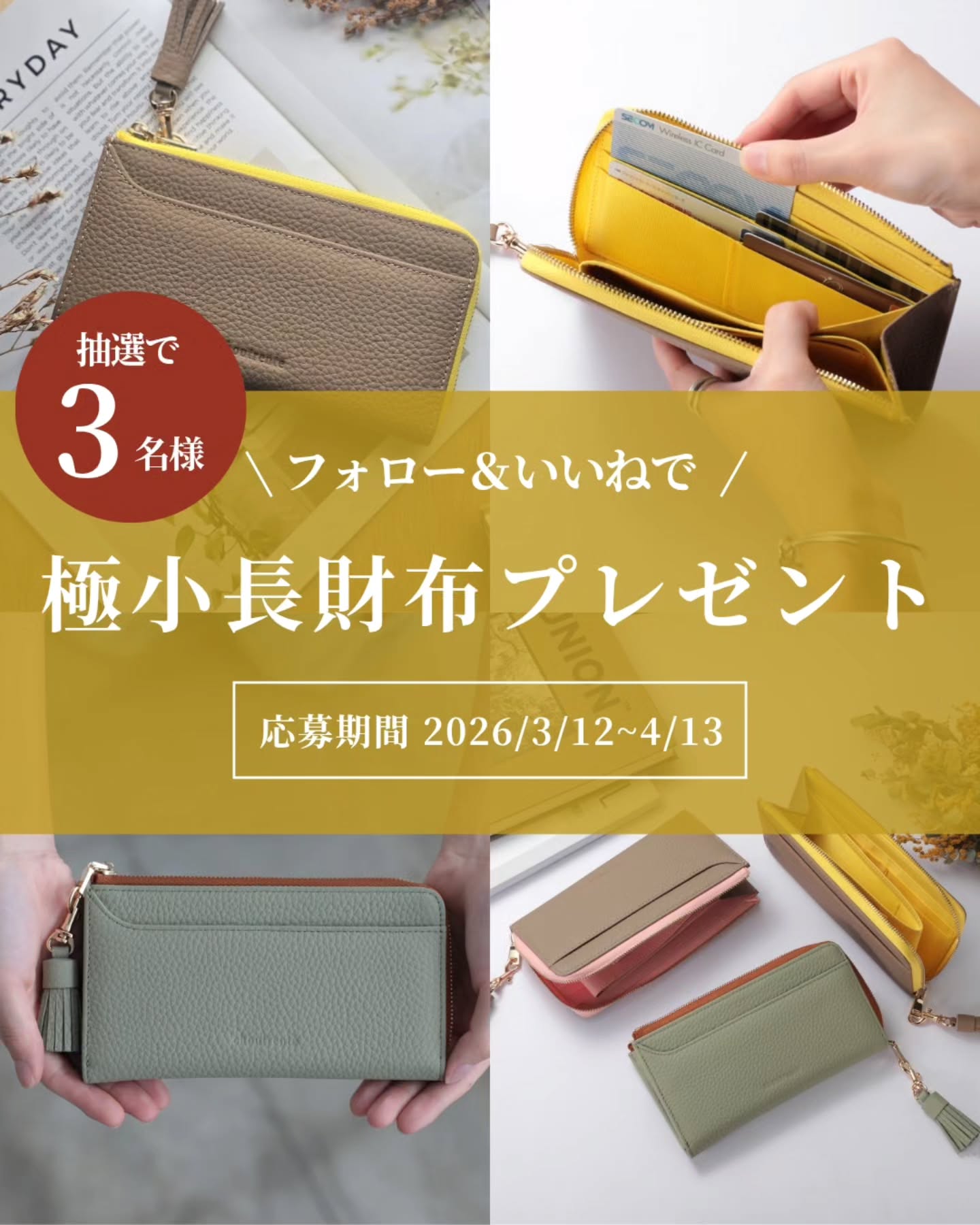 【Instagram懸賞】極小長財布を3名様にプレゼント 2026.04.11京童工房 楽天市場店‐フォロー&いいねキャンペーン 賞品:極小長財布(3名様) 締切:2026年4月13日(月)応募方法: 1. 公式Instagramアカウントをフォロー 2. 対象の投稿に「いいね!」※詳細はキャンペーンページにてご確認ください。応募はこちらから