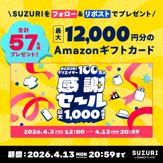賞品:Amazonギフト券最大12,000円分(57名様)