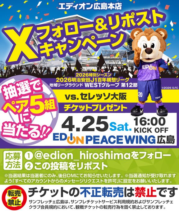 賞品:サンフレッチェ広島 4/25(土) セレッソ大阪 戦チケット(5組様)