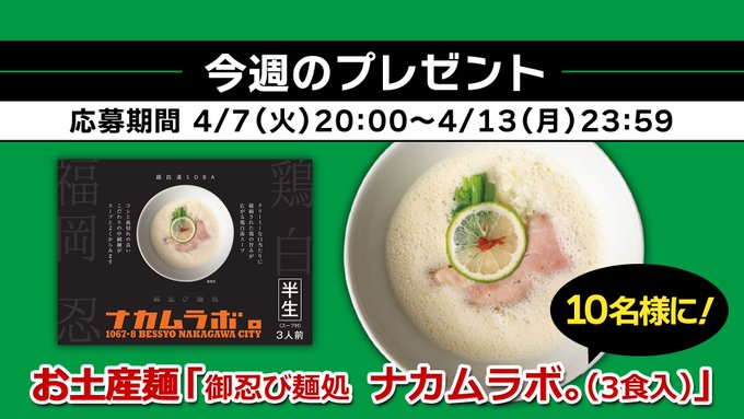 賞品:「御忍び麺処 ナカムラボ。」のお土産麺(10名様)