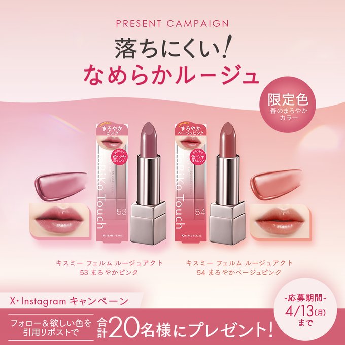 【X・Instagram懸賞】キスミー フェルム ルージュアクトを合計20名様にプレゼント 2026.04.11KISSME‐プレゼントキャンペーン 賞品:キスミー フェルム ルージュアクト(20名様) 締切:2026年4月13日(月)X・Instagram合計20名様にプレゼント✨※詳細はキャンペーンページにてご確認ください。応募はこちらから