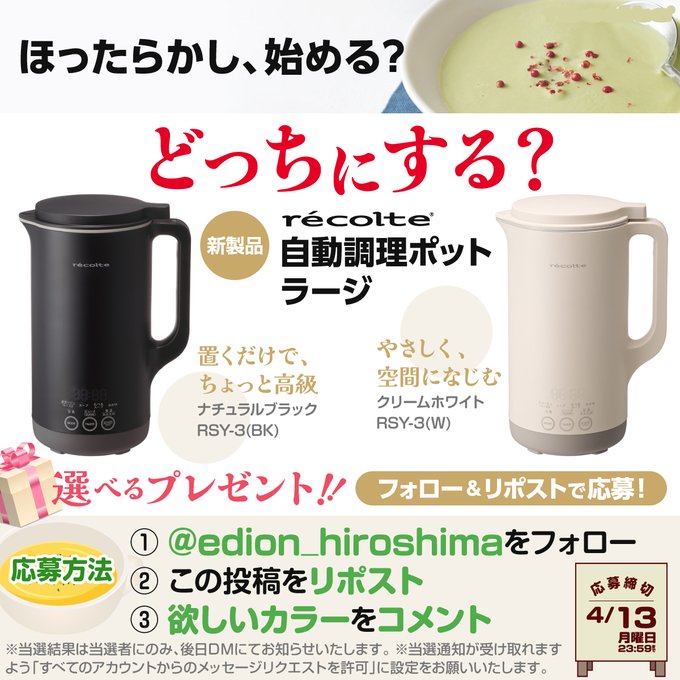 賞品:レコルト 自動調理ポット ラージ(2名様)