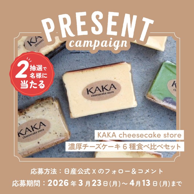 【X・Instagram懸賞】KAKAcheesecakestoreの濃厚チーズケーキ6種食べ比べセットを2名様にプレゼント 2026.04.11日産福岡販売株式会社‐プレゼントキャンペーン 賞品:KAKAcheesecakestoreの濃厚チーズケーキ6種食べ比べセット(2名様) 締切:2026年4月13日(月)応募方法は2STEP 1)アカウントをフォロー 2)投稿にコメントInstagramからも応募できます。※詳細はキャンペーンページにてご確認ください。応募はこちらから