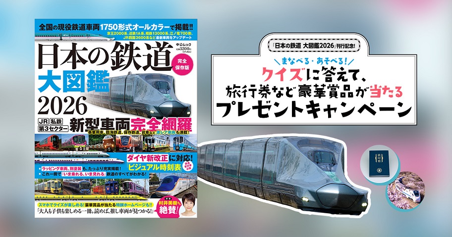 読売旅行旅行券1万円分、鉄印帳を合計15名様にプレゼント 2026.04.11『日本の鉄道 大図鑑2026』刊行記念 クイズに答えて、旅行券など豪華賞品が当たるプレゼントキャンペーン 賞品: 読売旅行旅行券1万円分(10名様) 鉄印帳(5名様) 締切:2026年6月15日(月)クイズに答えてご応募ください。※詳細はキャンペーンページにてご確認ください。応募はこちらから