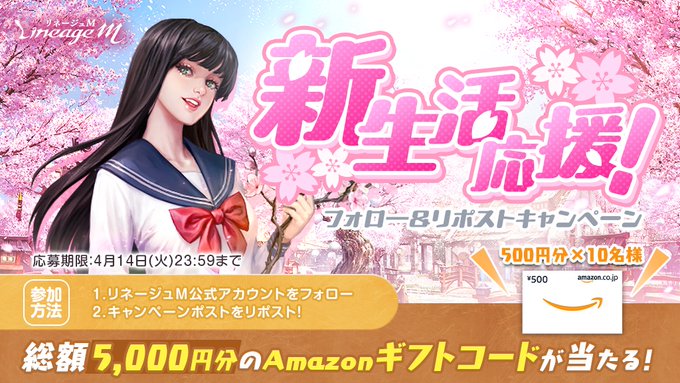 【X懸賞】Amazonギフト券500円分を10名様にプレゼント 2026.04.12リネージュM 新生活応援 賞品:Amazonギフト券500円分(10名様) 締切:2026年4月14日(火)公式X(Twitter)アカウントをフォロー&キャンペーン対象ポストをリポストしてご応募ください。※詳細はキャンペーンページにてご確認ください。応募はこちらから