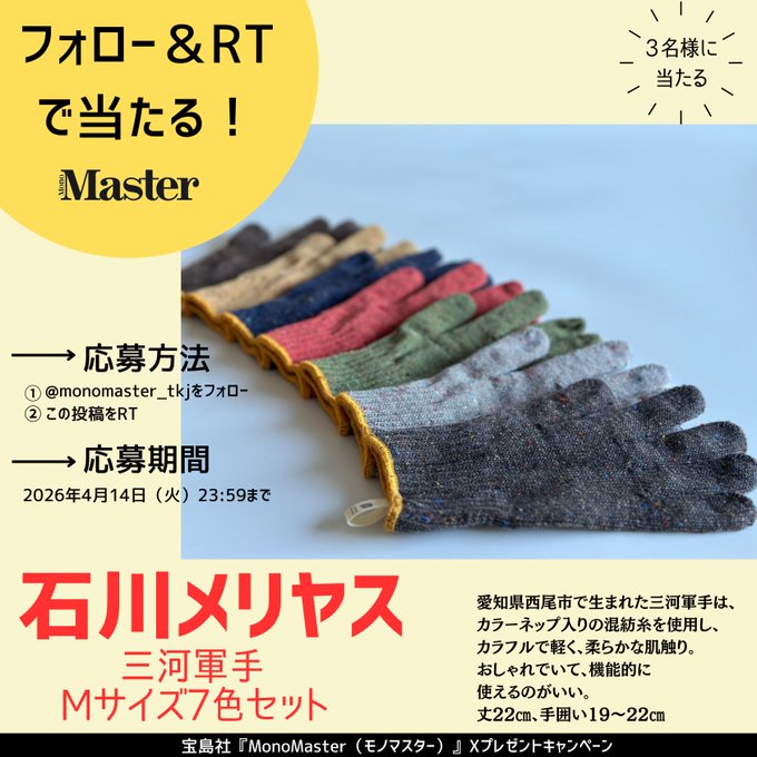 賞品:石川メリヤス の「#三河軍手」Mサイズ 7色セット(3名様)