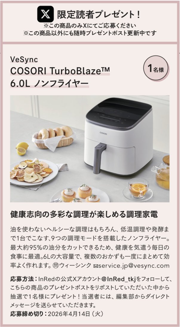 賞品:VeSync の COSORI TurboBlaze™ 6.0L ノンフライヤー(1名様)