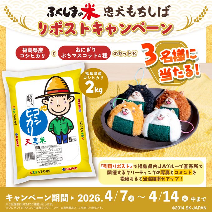 賞品:福岡県産コシヒカリ2kg&忠犬もちしば おにぎりぷちマスコット(3名様)