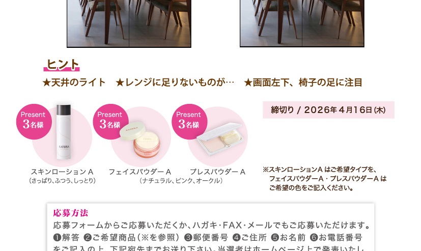 賞品:スキンローション、フェイスパウダー、プレスパウダー(合計9名様)