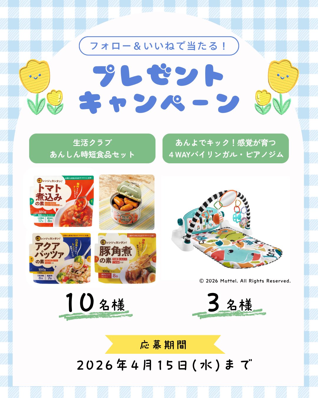 賞品:生活クラブ あんしん時短食品セット、あんよでキック!感覚が育つ4WAYバイリンガル・ピアノジム(合計13名様)