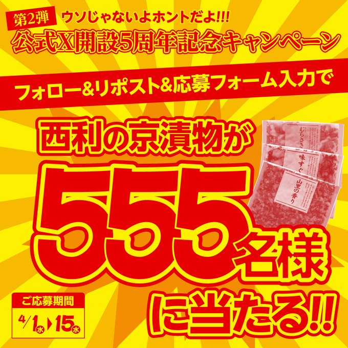 【X懸賞】西利の京漬物を555名様にプレゼント 2026.04.13京つけもの西利 X開設5周年記念 第2弾 賞品:京漬物(555名様) 締切:2026年4月15日(水)応募方法 ①フォロー ②投稿をRP ③応募フォームに入力※詳細はキャンペーンページにてご確認ください。応募はこちらから
