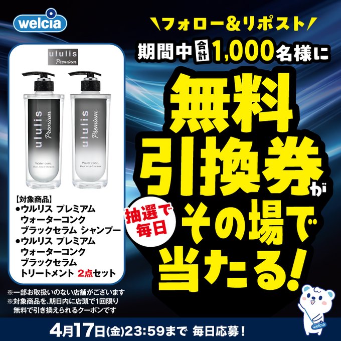 賞品:ウルリス プレミアム ウォーターコンク ブラックセラム シャンプー&トリートメント 2点セット 無料引換券(1,000名様)