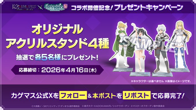 賞品:「ベル」「ヘスティア」「アイズ」「リュー」のオリジナルアクリルスタンド(合計20名様)