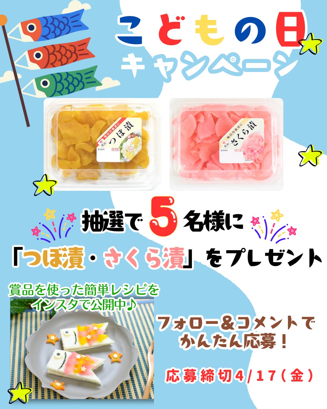【Instagram懸賞】子供の日にピッタリなお漬物を5名様にプレゼント 2026.04.15片山食品‐フォロー&コメントで当たる! 賞品:子供の日にピッタリなお漬物(5名様) 締切:2026年4月17日(金)1⃣ @katayama_pro をフォロー 2⃣ 「片山食品でこどもの日」とコメント※詳細はキャンペーンページにてご確認ください。応募はこちらから