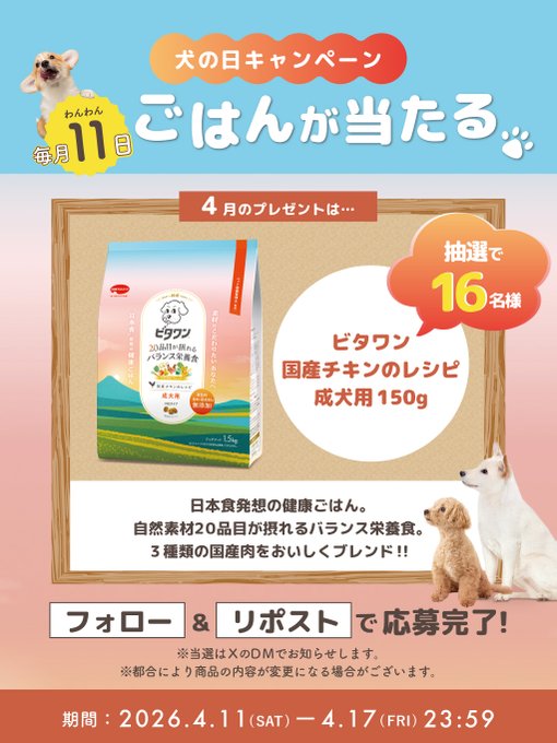 賞品:ビタワン 国産チキンのレシピ 成犬用(16名様)