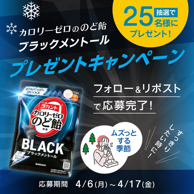 【X懸賞】カロリーゼロのど飴 ブラックメントールを25名様にプレゼント 2026.04.15SARAYA‐#カロリーゼロのど飴 プレゼントキャンペーン 賞品:ラカントシリーズの新商品「カロリーゼロのど飴 ブラックメントール」(25名様) 締切:2026年4月17日(金)応募方法 投稿を「いいね&リポスト」。※詳細はキャンペーンページにてご確認ください。応募はこちらから