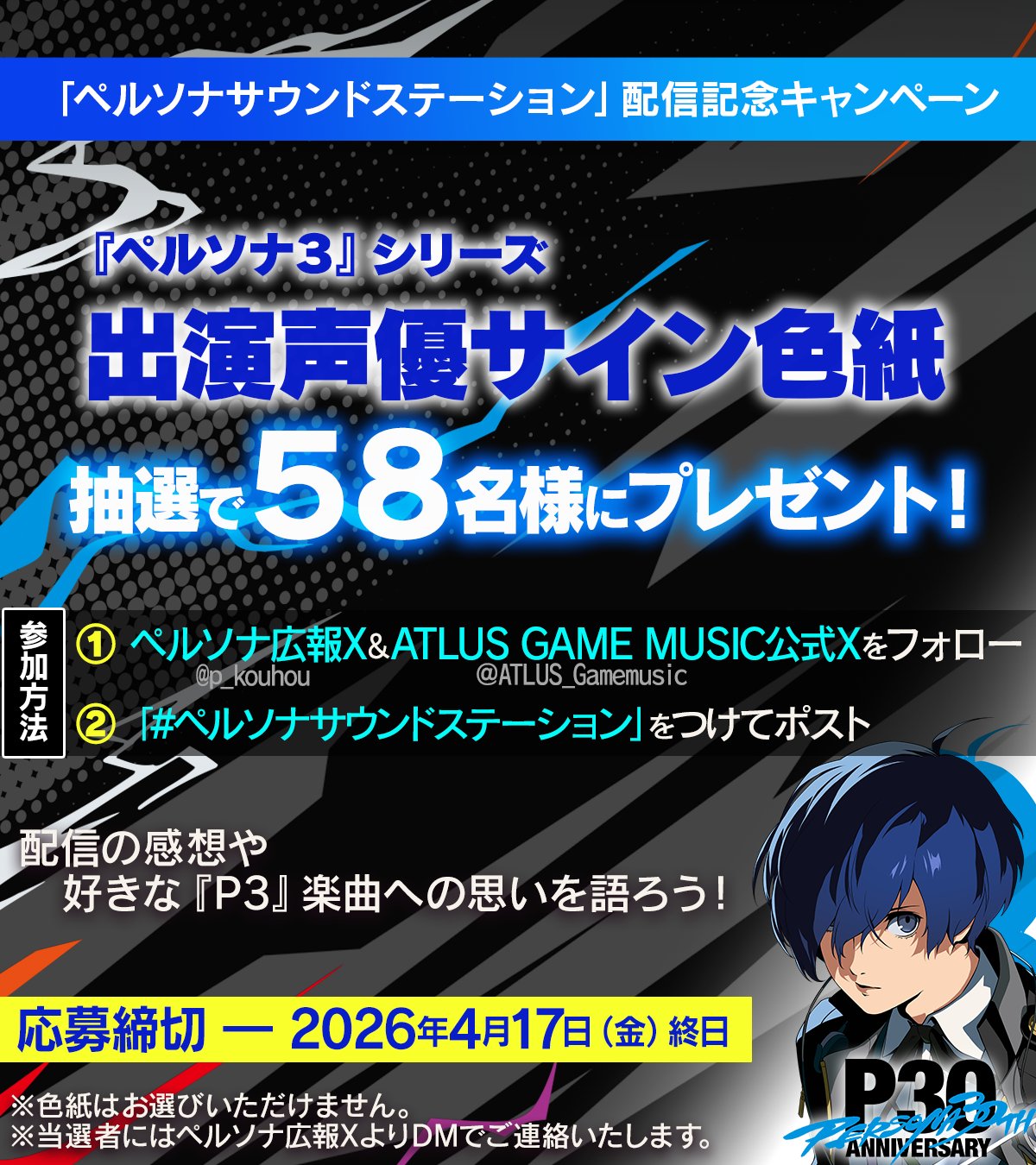 賞品:『ペルソナ3』シリーズ出演声優サイン色紙(58名様)
